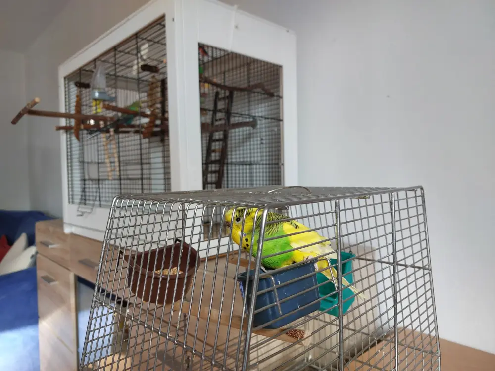 Am Ende hüpfte er in den Käfig. Bissel Futterneid, bissel Hacken gab es am Anfang. Ein weiterer Napf löste auch das Problem.