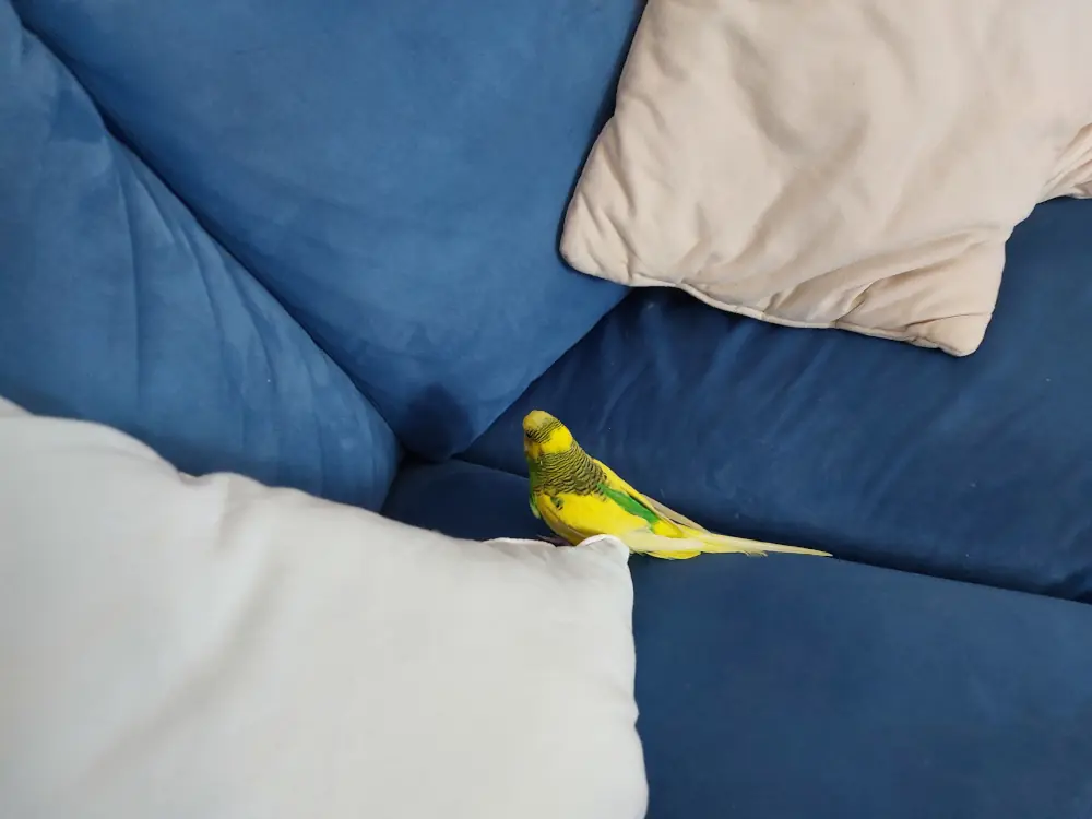 Irgendwann hat es mir gereicht, Willy raus aus dem Käfig. Er flog ne Runde, landete auf dem Sofa.