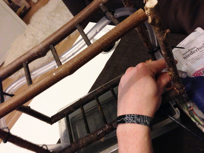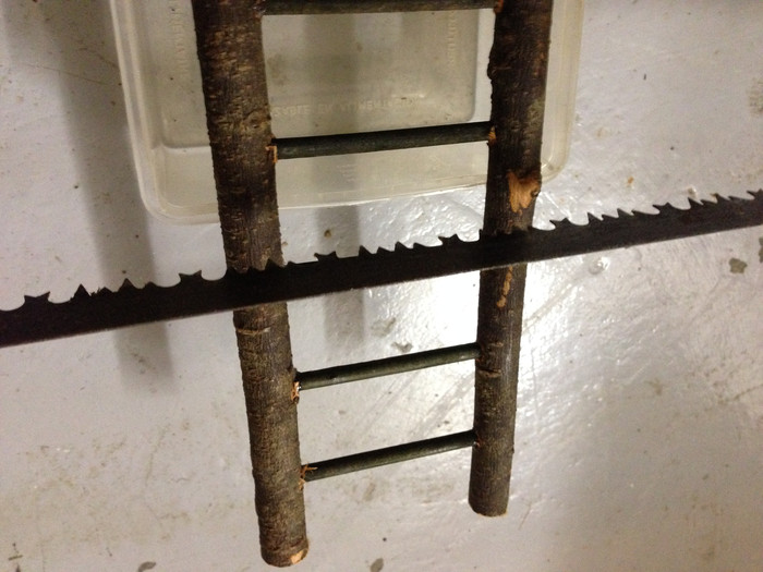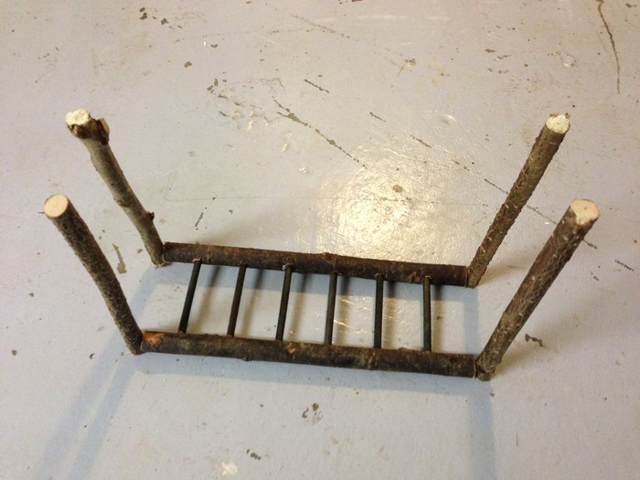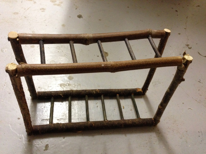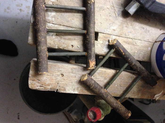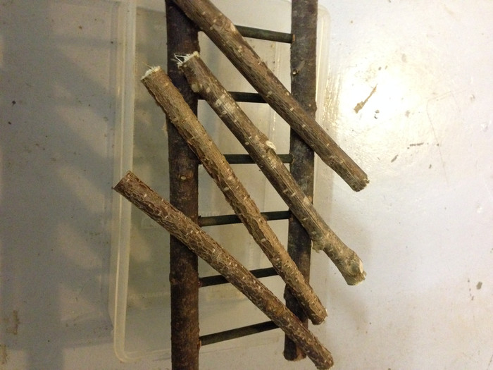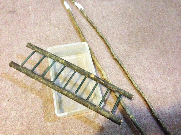 Die Basis bildet eine alte Tupperschüssel, zwei Holzleitern aus Naturholz, sowie zwei Stangen aus Naturholz: