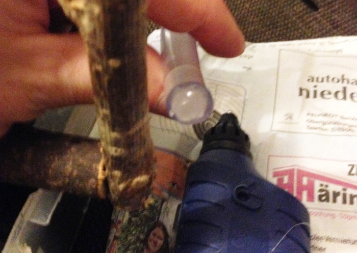 Das Ende des Schlauches wird nach dem Durchfädeln und Befestigen gekürzt. Das Ende mit Heißkleber verschlossen.