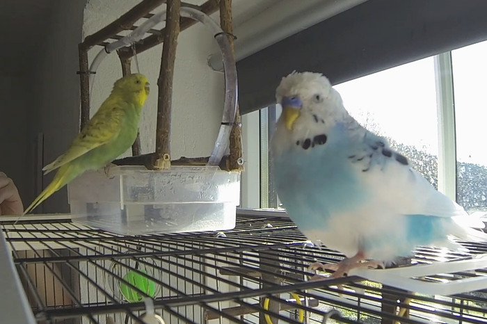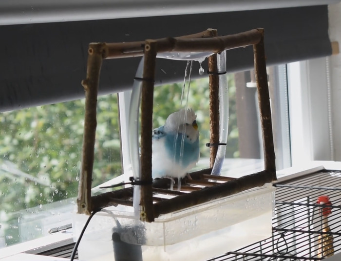Vor einiger Zeit kam ich auf die Idee den Tierchen eine Vogeldusche zu bauen. Ich hatte als Kind mal einen sehr zahmen Wellensittich. Der liebte es im Waschbecken unter dem Wasserhahn ausgiebig zu duschen. Ich hatte meinen Wellis bereits mal ein Vogelbad an den Käfig gehängt, dieses wurde aber weitestgehend ignoriert bzw. nur als weiterer Trinknapf wahrgenommen.