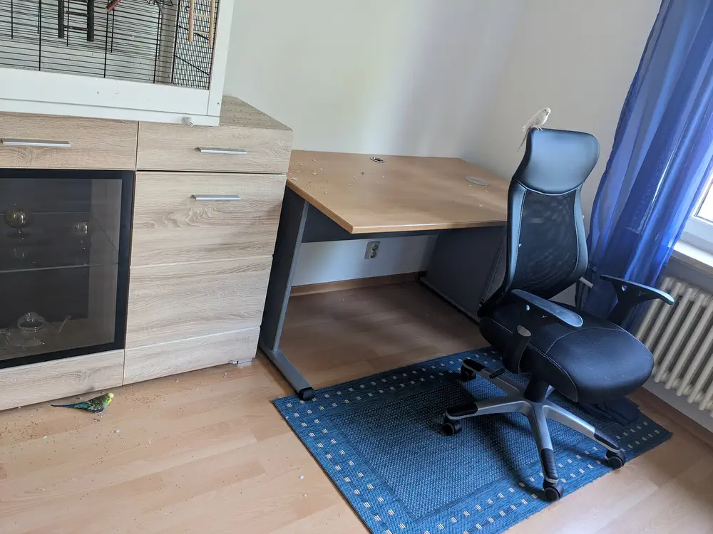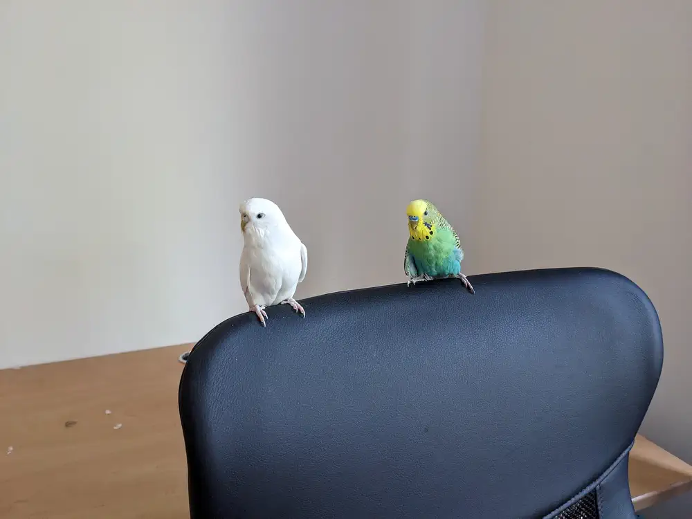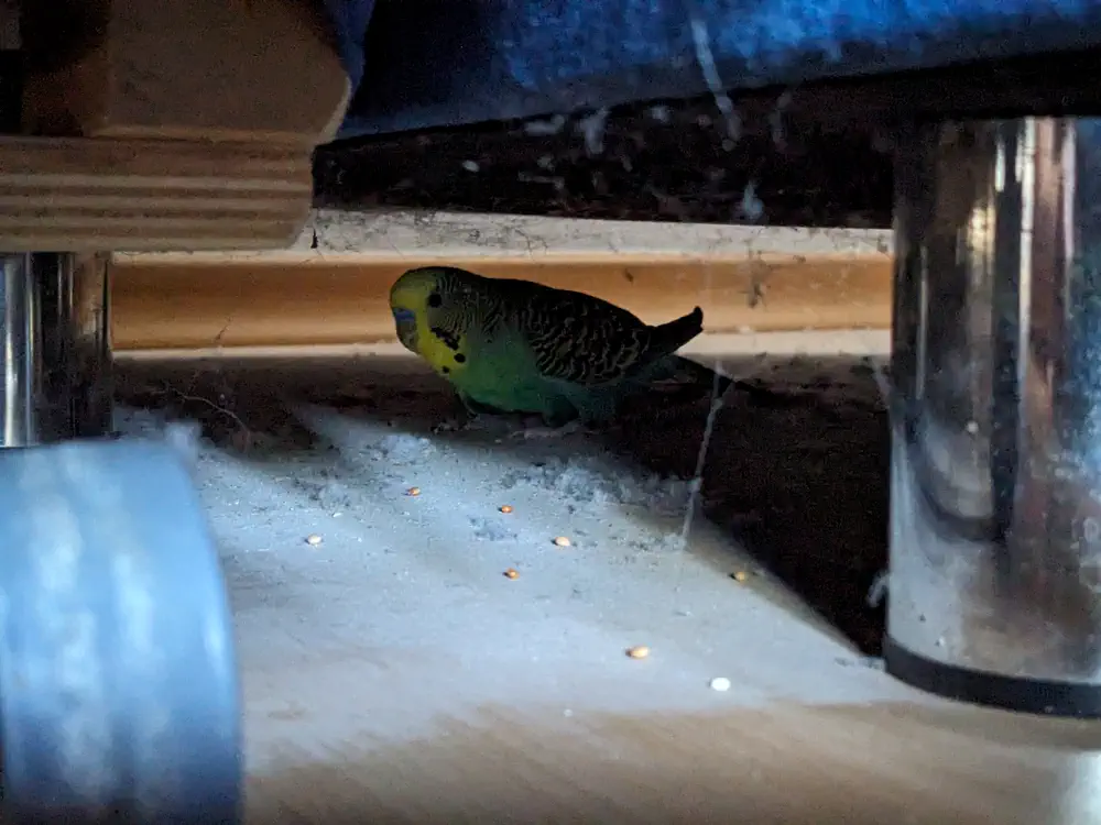 Nun gab es gestern etwas Geschrei und Geflatter, da musste ich dann mal nachsehen. Beide hatten den Käfig verlassen. Franz war, wie so oft, am Boden, konnte nicht mehr hoch. Wölkchen saß auf dem Bürostuhl und fühlte sich dort anscheinend wohl.