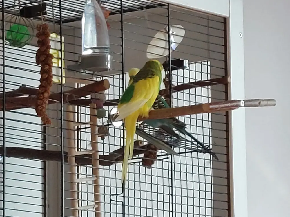 Am Ende hüpfte er in den Käfig. Bissel Futterneid, bissel Hacken gab es am Anfang. Ein weiterer Napf löste auch das Problem.