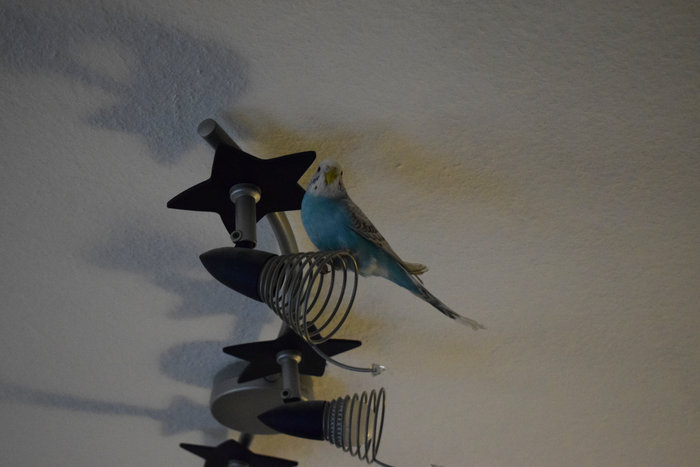 Er hat auch bereits einen neuen Lieblingsplatz für sich gefunden, auf der Lampe. Von dort dürfte er genug Überblick über das Büro haben.
