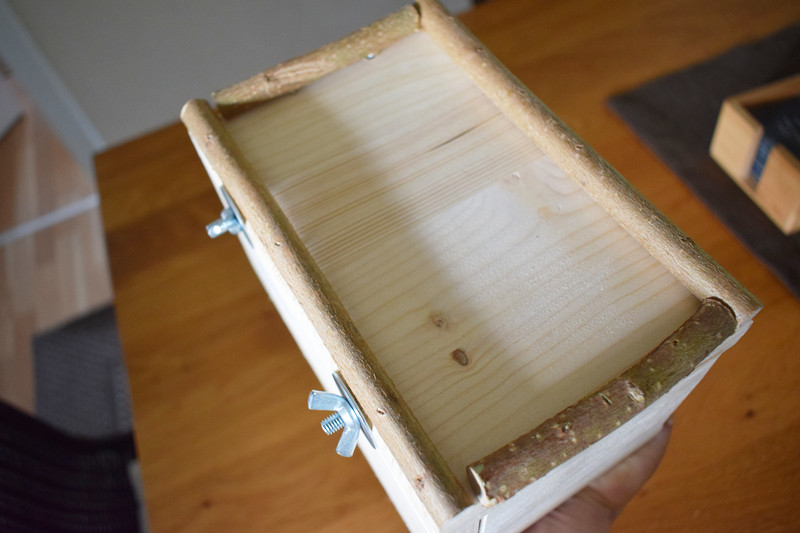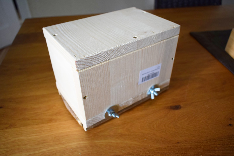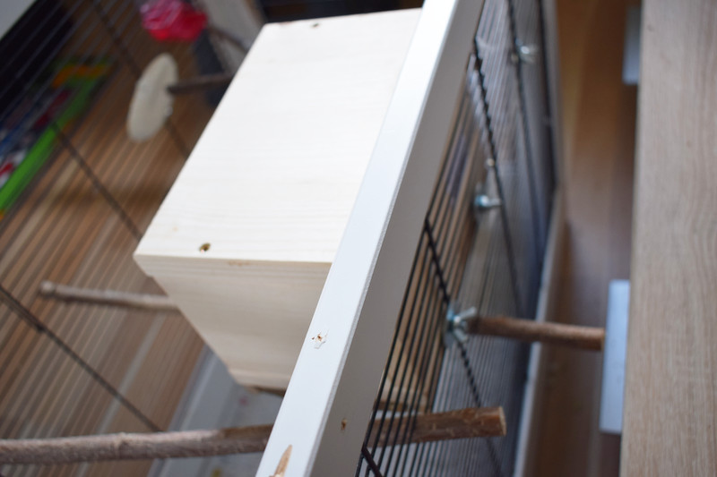 Das Haus selbst macht einen guten Eindruck, es ist gut verarbeitet, stabil und damit auch etwas schwer und klobig. Es besteht aus unbehandelten Holz, auf der Unterseite sind Naturäste angebracht. Mit zwei Flügelmuttern wird es am Käfig festgemacht. Es nimmt schon ordentlich Platz weg und ist nur für größere Käfige geeignet. Angebracht ist es leicht.