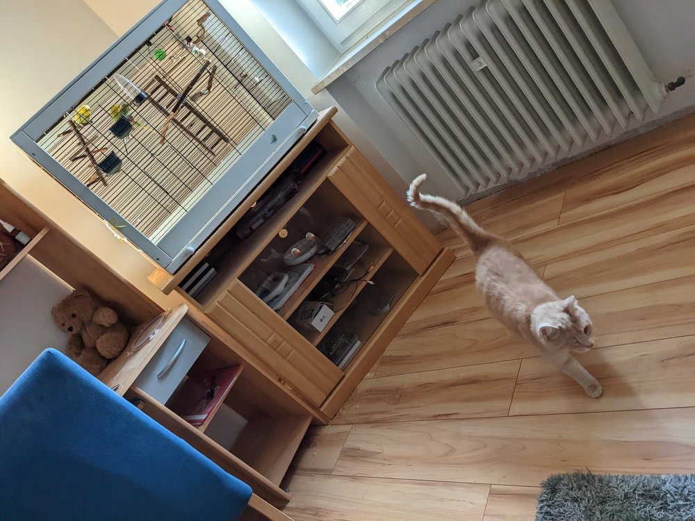 Nachbarskatze hat sich ins Haus geschlichen und die Wellensittiche besucht. Während die Wellensittiche durchaus skeptisch waren, hat die Katze diese gar nicht wirklich wahrgenommen. Entweder, weil der einäugige Bandit die Wellis die nicht richtig gesehen hat oder weil so bunte Tierchen in seiner Welt nicht vorkommen.