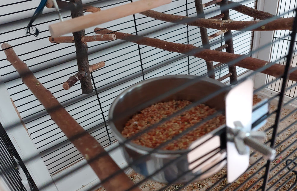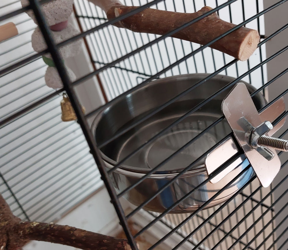 Seit ein paar Wochen haben die Welli Spaß daran gefunden, ihre kleinen Futternäpfe herunterzureißen. Das macht jede Menge Dreck und sorgt dafür, dass die Wellis halt nix mehr zu beißen haben. Gut außer sie machen auf Huhn und gehen auf den Boden.