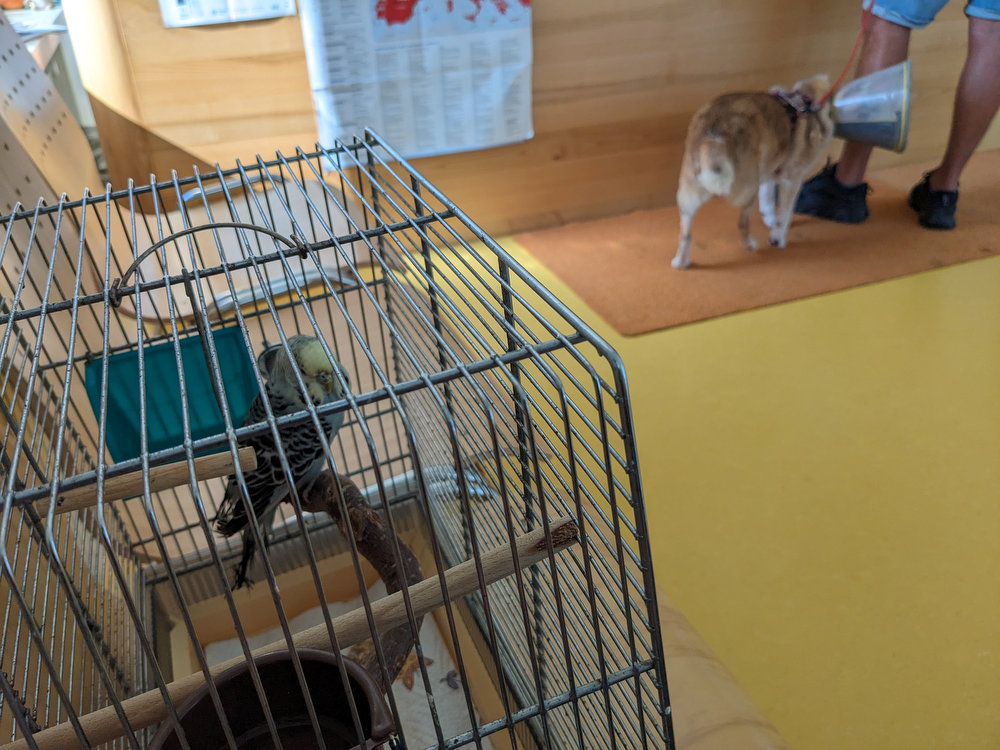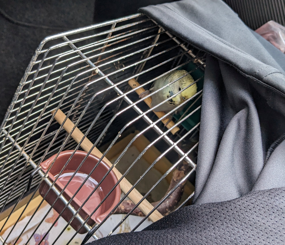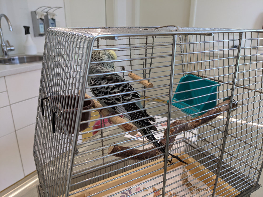 Also ab zum Tierarzt. Sicher ist sicher. Also alles abgedunkelt und den Piepmatz eingefangen. Ich mache das immer sehr ungern, aber hilft ja nichts. Ab in den kleinen Käfig und ab zum Tierarzt nach Hopferau. Das sind auch immer 40 Minuten Tour, einfach.