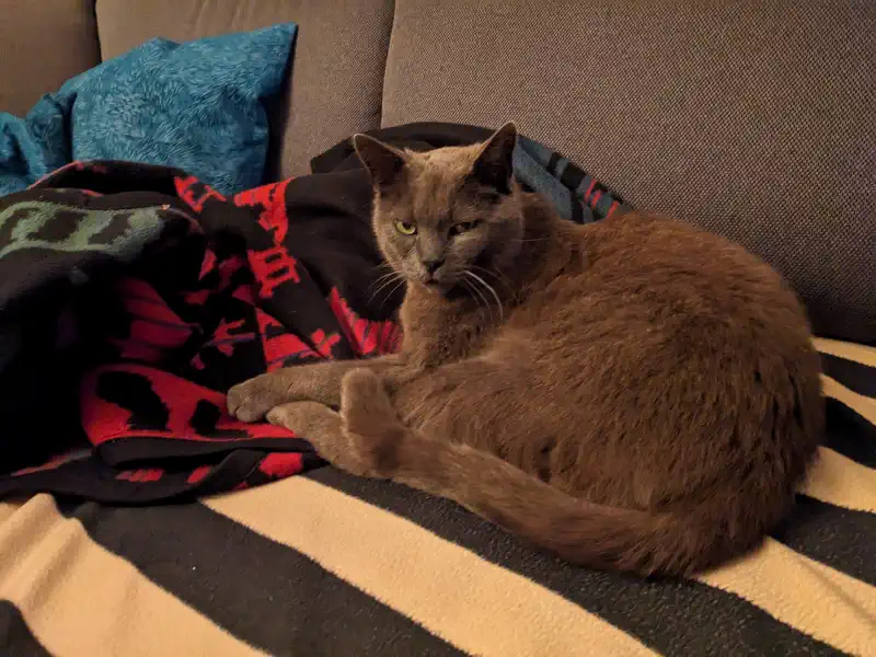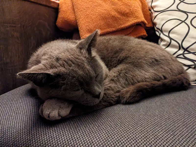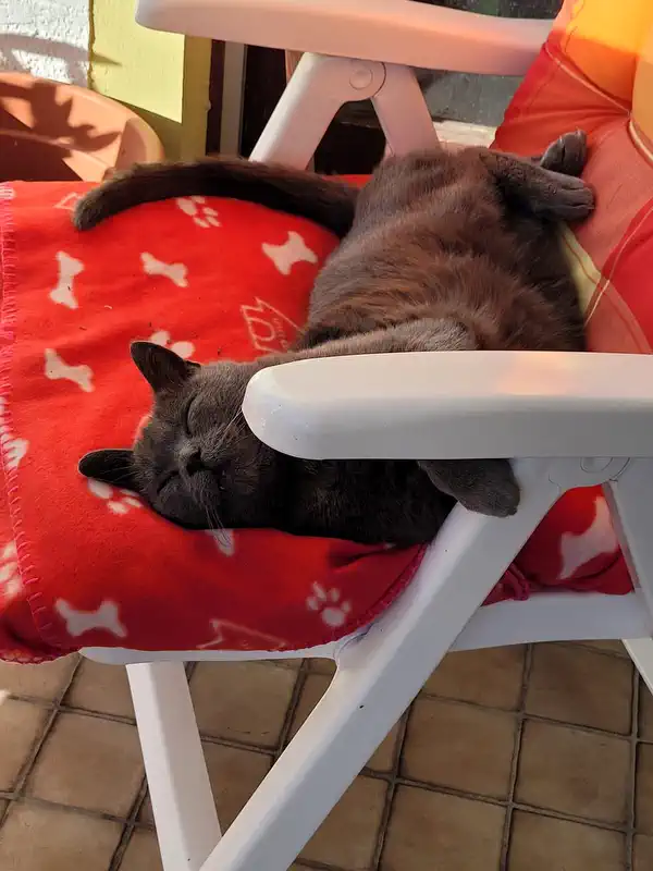 Dort konnte er irgendwann nicht mehr bleiben, wegen Umzug, eine Katze war tabu. So kam er zu uns. Er hat sich sofort zu Hause gefühlt. Pragmatisch halt. Bereits am ersten Abend saß er mit uns auf dem Sofa, die Nacht lag er am Fußende im Bett.